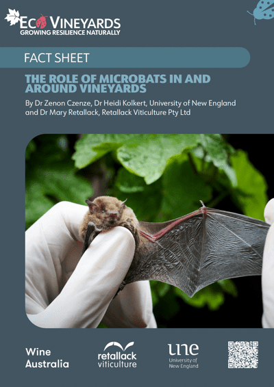 By Dr Zenon Czenze, Dr Heidi Kolkert, University of New England and Dr Mary Retallack, Retallack Viticulture Pty LtdAbout this fact sheet Microbats are an important predator of grapevine insect pests. Learn more about microbats and how you can encourage their presence in and around vineyards.DOWNLOAD FACT SHEET