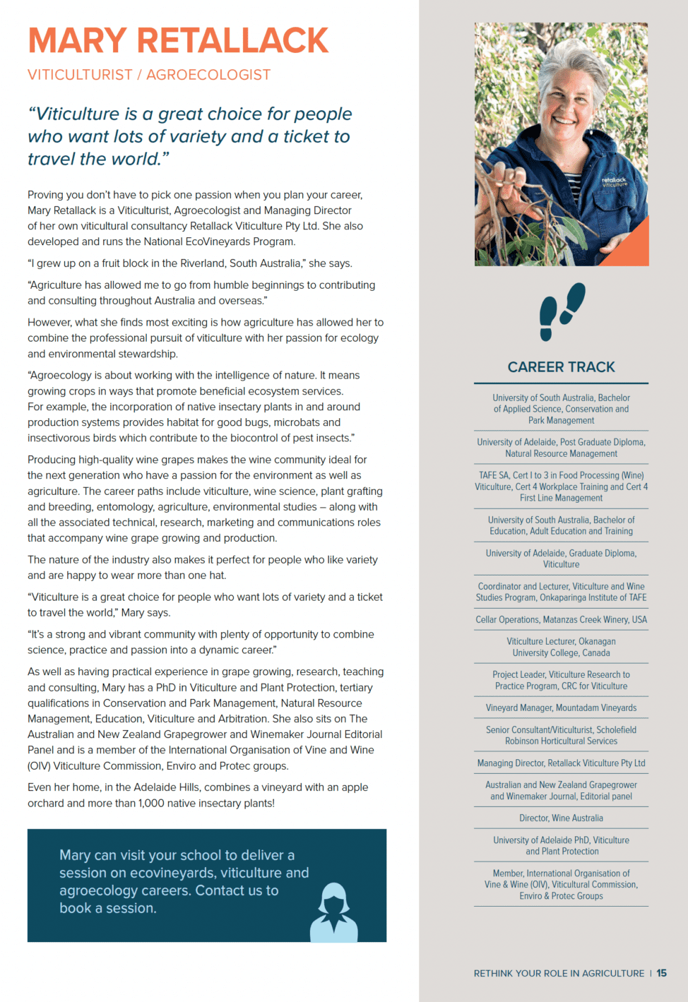 Proving you don’t have to pick one passion when you plan your career, Mary Retallack is a Viticulturist, Agroecologist and Managing Director of viticultural consultancy Retallack Viticulture Pty Ltd. She also founded and runs the National EcoVineyards Program.